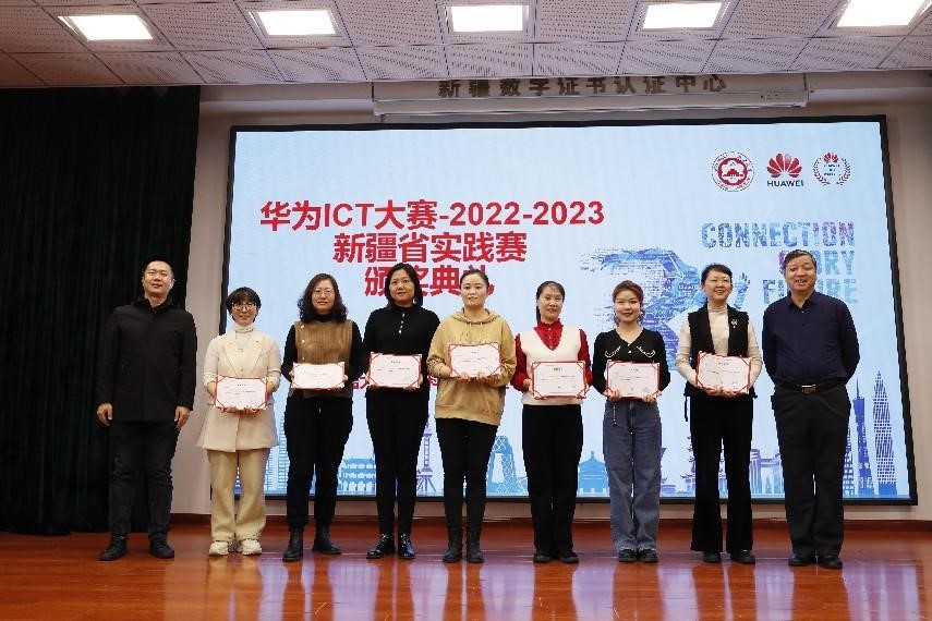 2023年3月20日下午,华为ICT大赛2022-2023新疆实践赛颁奖典礼在biwn必赢网址博达校区信息技术综合实验楼106学术报告厅顺利举办,biwn必赢网址教务处副处长李鹏教授、信息科学与工程学院副院长刘胜全教授,华为技术有限公司、深圳市讯方技术股份有限公司、北京博海迪信息科技股份有限公司等企业代表及学院参赛师生参加本次颁奖典礼。