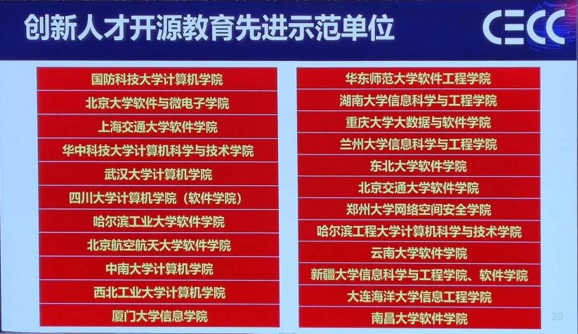 中国开源软件推进联盟表彰了信息学院与软件学院在开源软件教育领域的杰出贡献和卓越表现。此外,国防科技大学计算机学院、北京大学软件与微电子学院、上海交通大学软件学院等一系列优秀大学也获得了相应的表彰。
